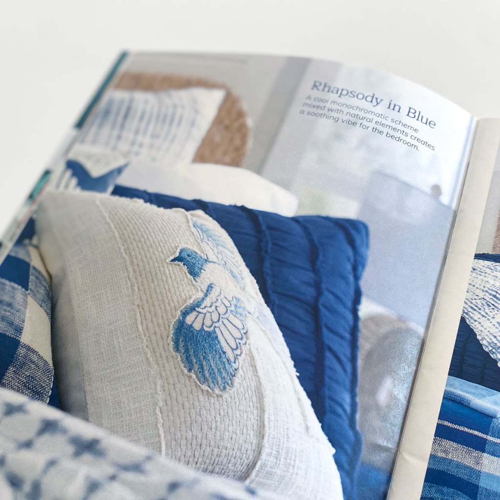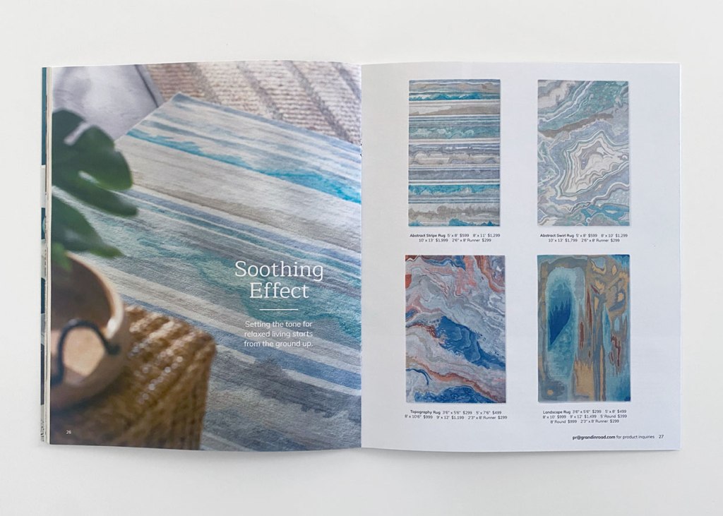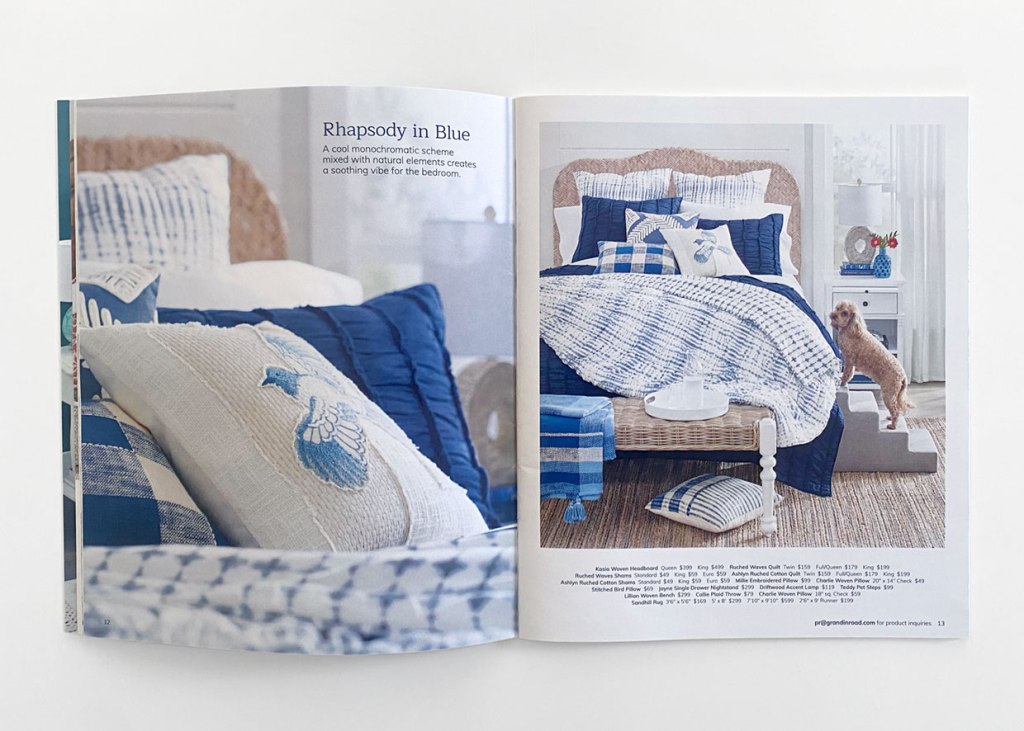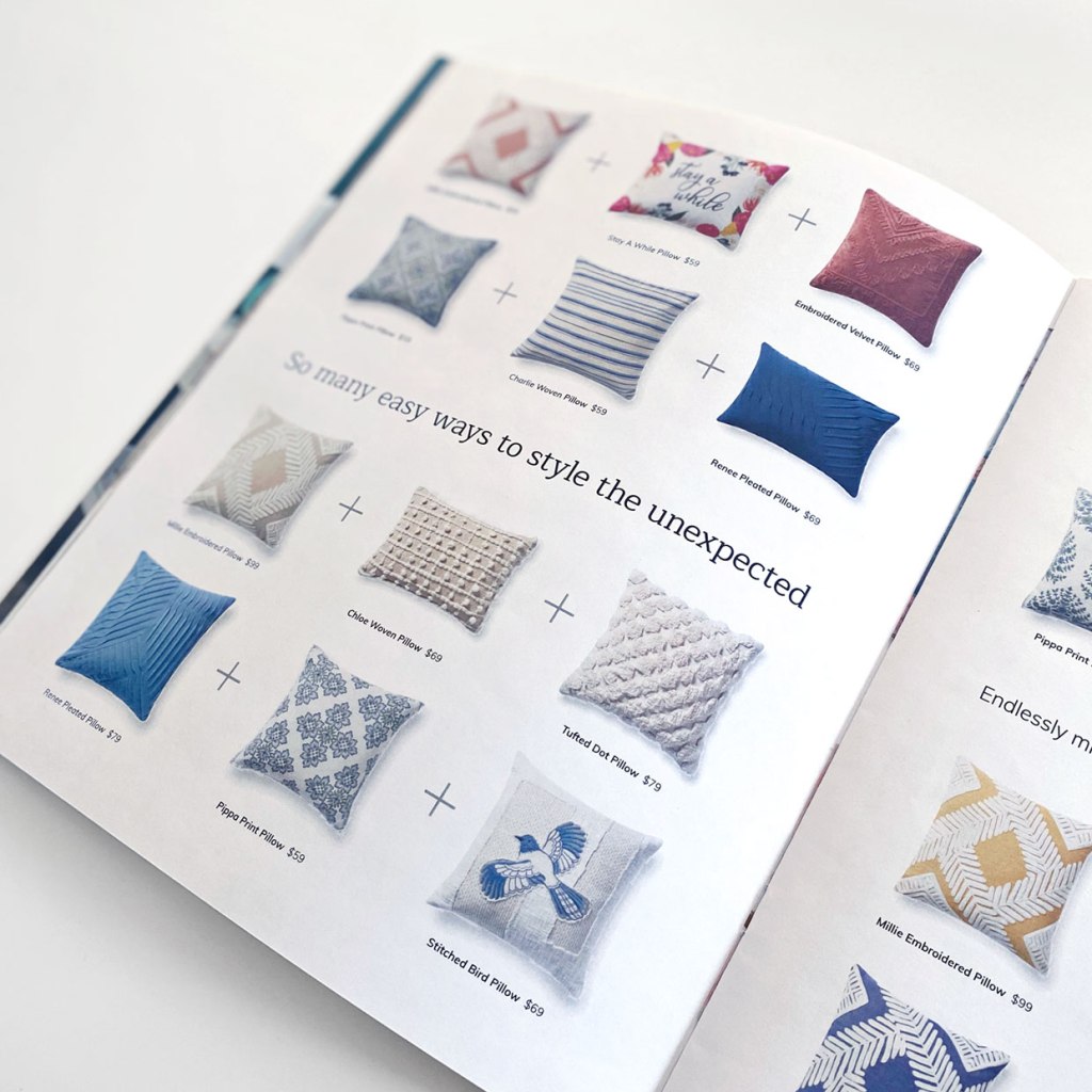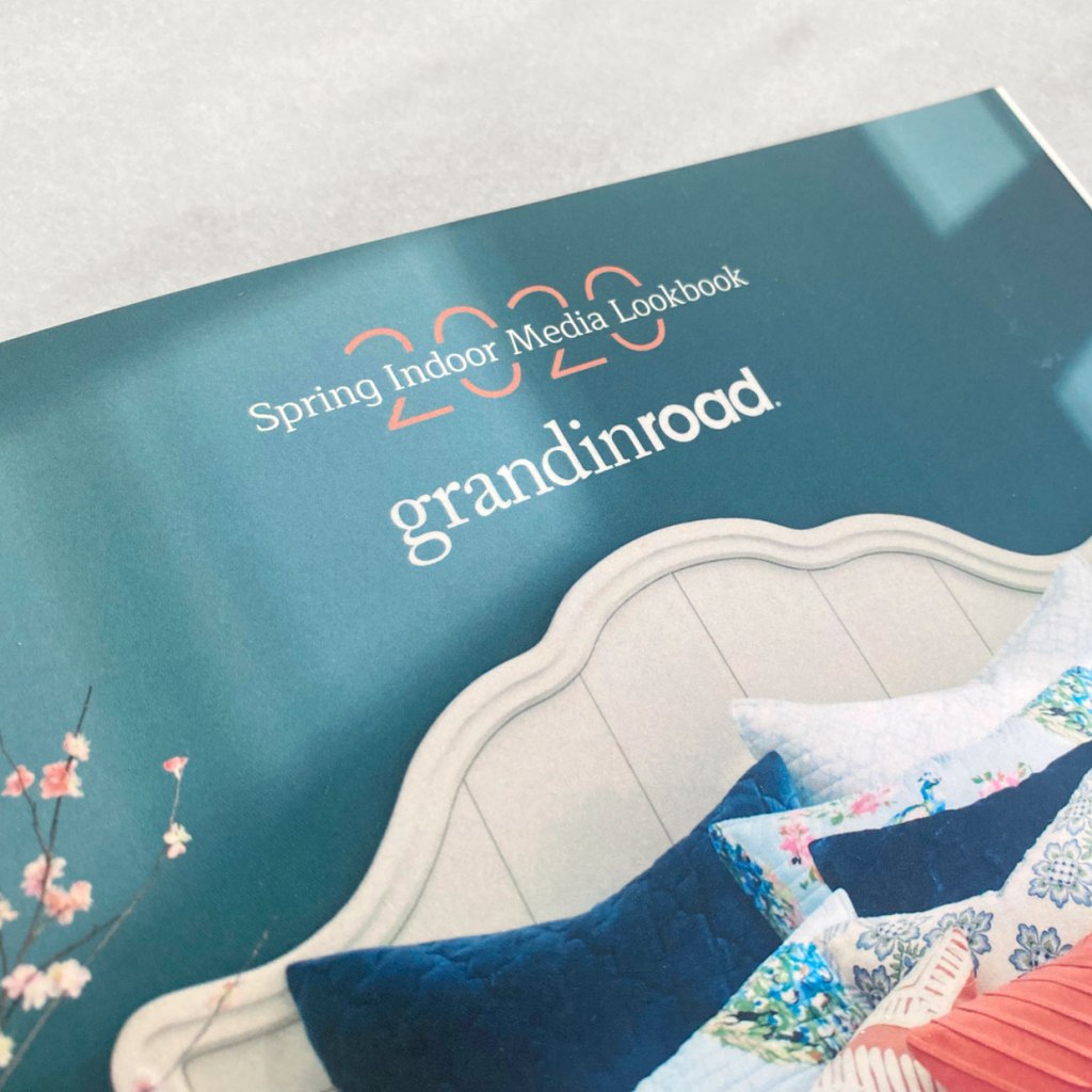 While working as the Production Designer at Grandin Road, one responsibility that I took pride in was designing media lookbooks. These were booklets that were sent out to media companies, magazines, television networks, and bloggers to get press and exposure for the products. I collaborated with the Marketing, Editorial, and Merchandising departments to complete these projects. The Marketing team would start out the project by providing a list of stories to be featured, and I would then look through the photography library and create layouts to tell those stories. For this particular lookbook, they requested stories showing different guest room looks, throw pillow mixing and matching, and organization solutions. I had a lot of creative freedom when designing these media lookbooks, so they were always fun and inspiring projects.