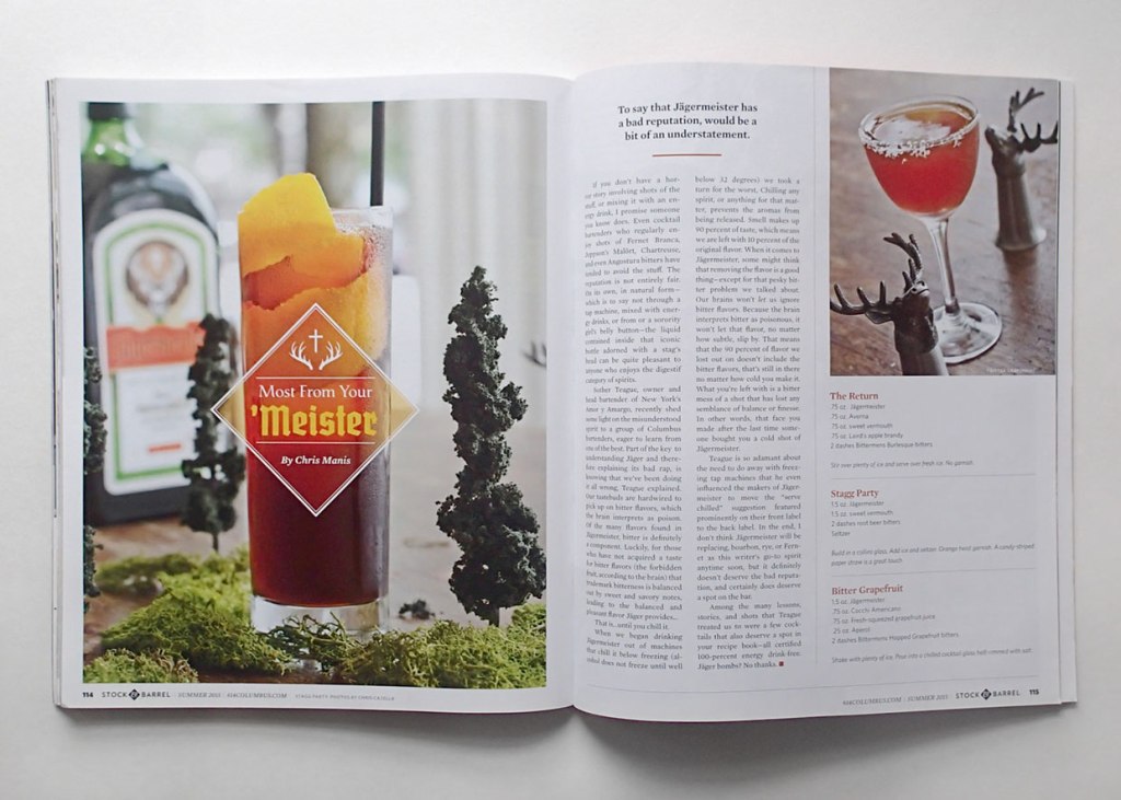 I designed this layout for the food and drink magazine Stock & Barrel in Columbus, OH. I love using typography, graphics, and layering effects to compliment images. I had a lot of fun incorporating all of those elements while designing this spread about elevating Jägermeister with cocktail recipes.