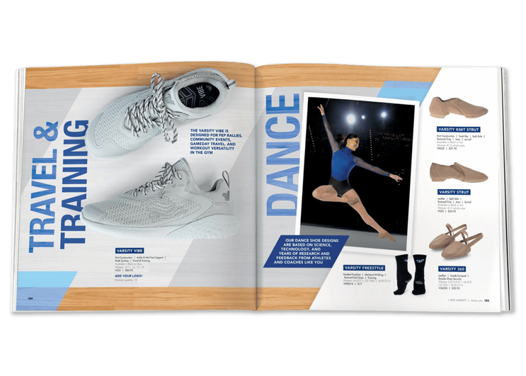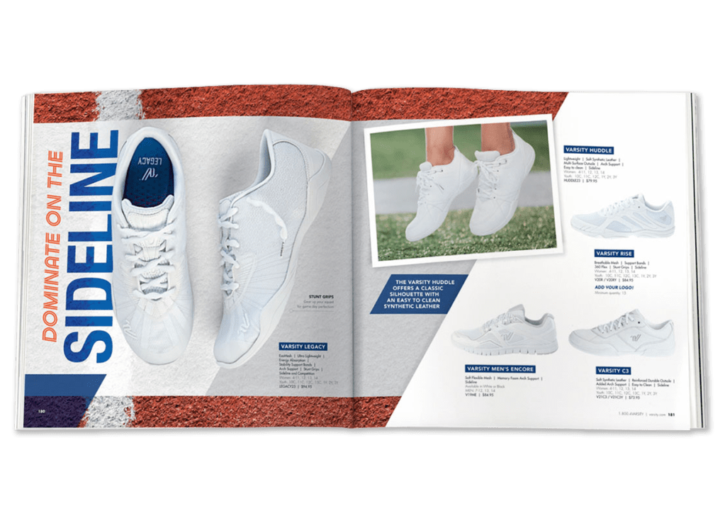 I was responsible for developing and executing the shoe section of the 2023 Varsity Spirit Catalog. I created the initial concept and designed layouts using placeholder photography, establishing the visual direction for the spreads. During a two-day trip to Dallas, I provided on-set art direction, styled the shoes, and collaborated with the photography team to ensure each product shot aligned with the concept. After the shoot, I integrated the final images into the layouts, creating detailed mockups for the Premedia Artists to accurately execute the spreads. This project allowed me to guide the section from concept through completion, delivering a cohesive and polished final presentation.