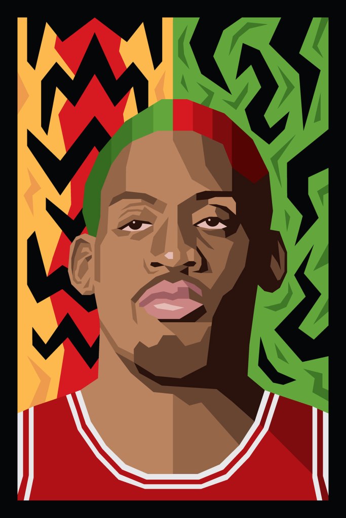 For this illustration, I sought to capture the unique personality of enigmatic NBA star Dennis Rodman. The red, yellow, and black design on the left, as well as the green and black design on the right were inspired by two different hair styles he sported during his playing career.