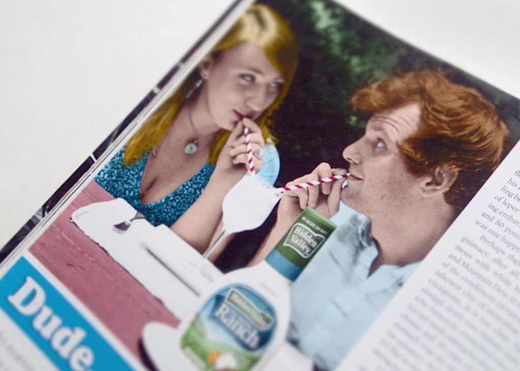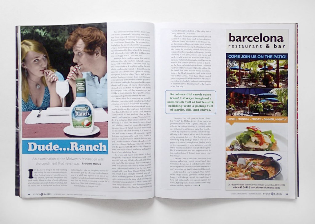 I did this photographic illustration and layout during my time as the Lead Designer of the food and drink magazine Stock & Barrel in Columbus, OH. The article was a humor piece, and something of a love letter to ranch dressing. When I saw the photo for the article, I felt like it needed some stylization to emphasize its tongue in cheek nature. I thought the imagery would miss the mark if it were a normal photograph of two people romantically sipping ranch dressing from straws straight out of the bottle. I converted the photo to high contrast black and white, and then digitally added graphic colors underneath it. I thought this look worked for the piece because it made the photo less grounded in reality, and give a wink to the reader that the article leaned heavily into humor.