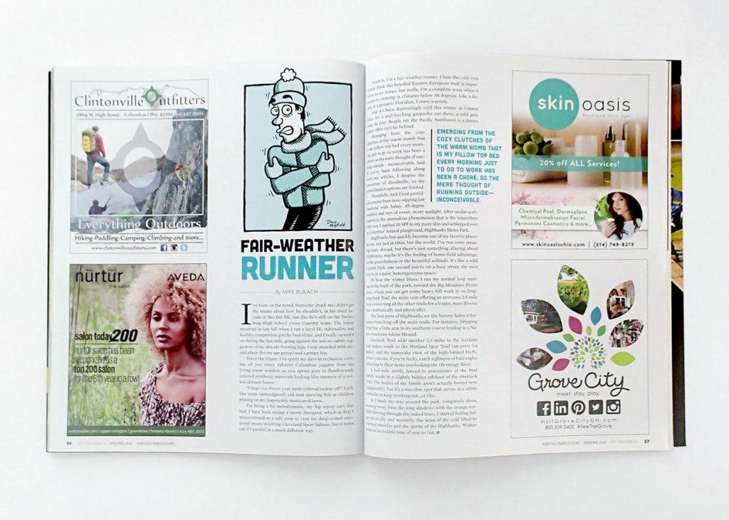 I did this illustration and layout for an article in the fitness magazine FIT Columbus. The article was a humor piece written by a runner who struggled to maintain his routine during the cold months of the year. I started the illustration by hand, then scanned my drawing, refined it and added color digitally.
