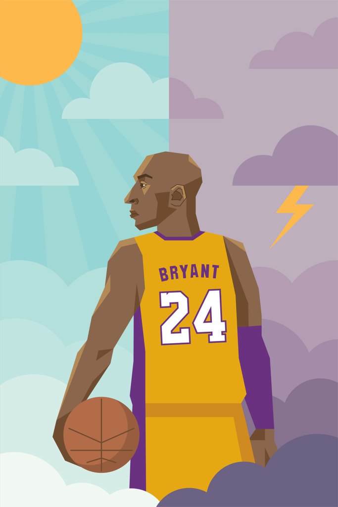 I did this illustration for a friend shortly after Kobe Bryant, his daughter Gianna, and seven others tragically passed away in a helicopter crash in January 2020. The title of the piece, “Mamba Out,” is in reference to Kobe’s nickname that he gave to himself, The Black Mamba, and his farewell speech after his last NBA game in April 2016. In his final performance, Kobe scored 60 points and hit the game winning shot. After the game, he spoke about growing up a die-hard Lakers fan, and described his NBA career as “absolutely beautiful.” He thanked the fans, and then thanked his wife Vanessa and daughters Natalia and Gianna for their sacrifices that allowed him to train and play professional basketball. He closed the speech by saying, “What can I say, Mamba out,” and walked off of the court. The concept of this piece with the background divided in half by light and dark skies was inspired by various quotes from Kobe:
